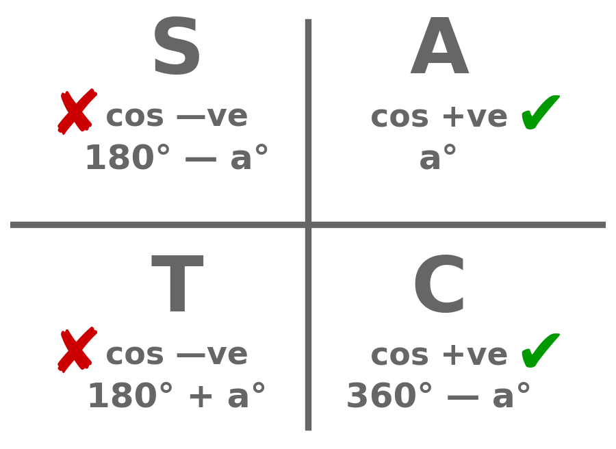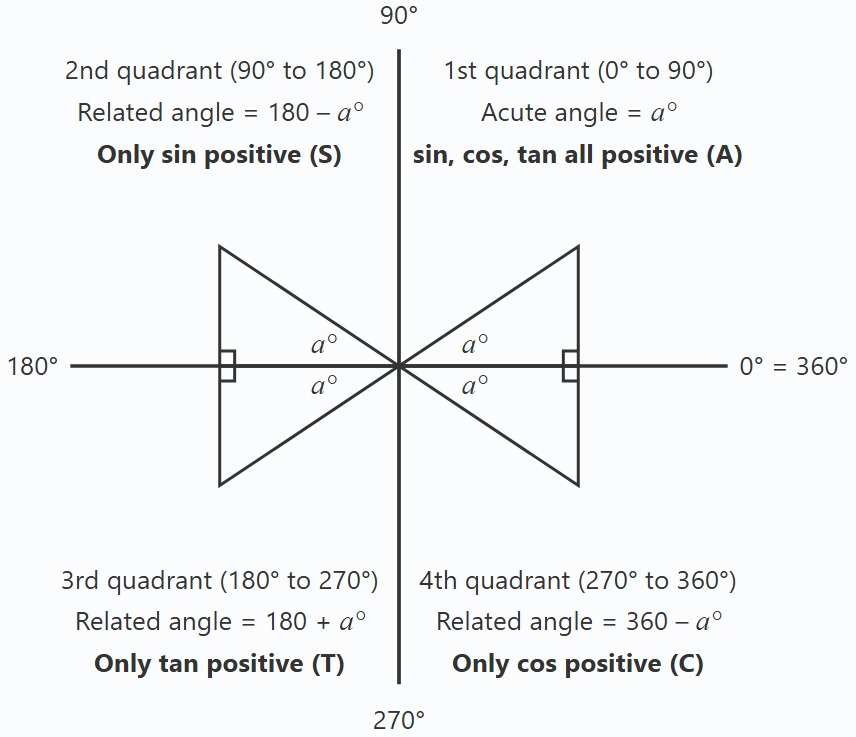 - 1st quadrant: The actual angle is \(a^\circ\small.\)