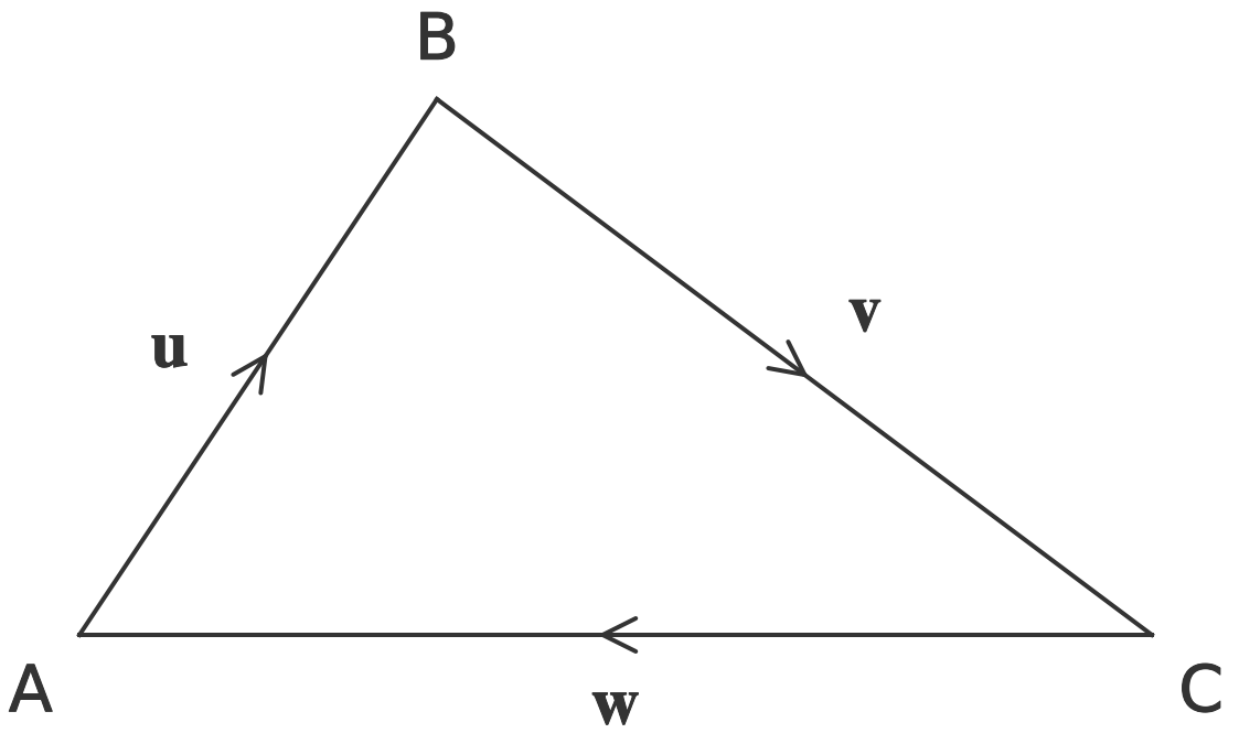 In the diagram below, \( \boldsymbol u \), \( \boldsymbol v \) and \( \boldsymbol w \) represent \( \overrightarrow{\textsf{AB}}\small,\) \(\overrightarrow{\textsf{BC}}\) and \(\overrightarrow{\textsf{CA}}\) respectively.