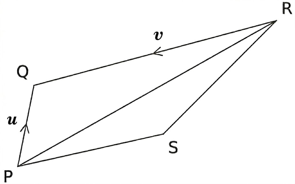 Let \(\overrightarrow{\textsf{PQ}}=\boldsymbol u\) and \(\overrightarrow{\textsf{RQ}}=\boldsymbol v\small,\) as shown.